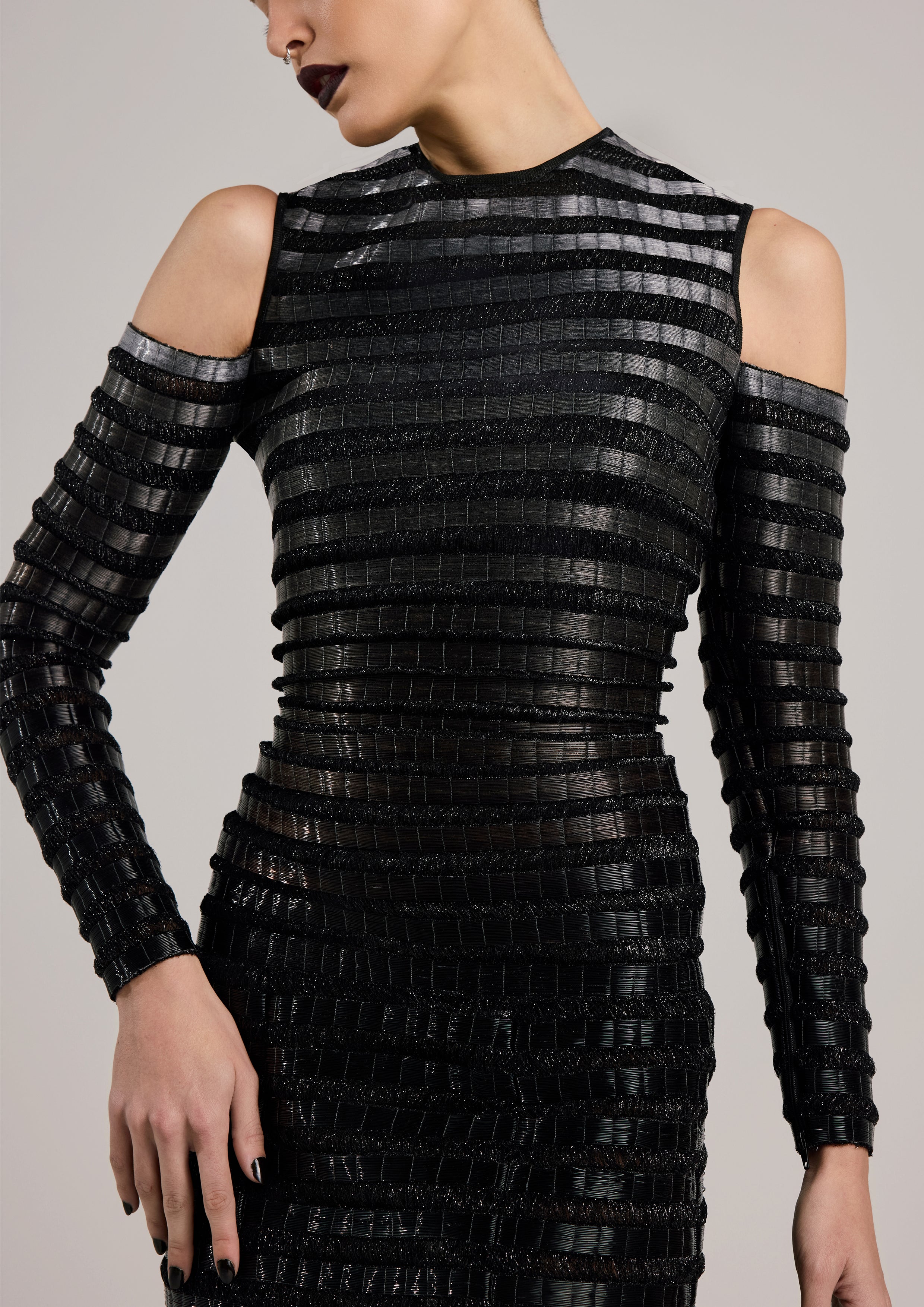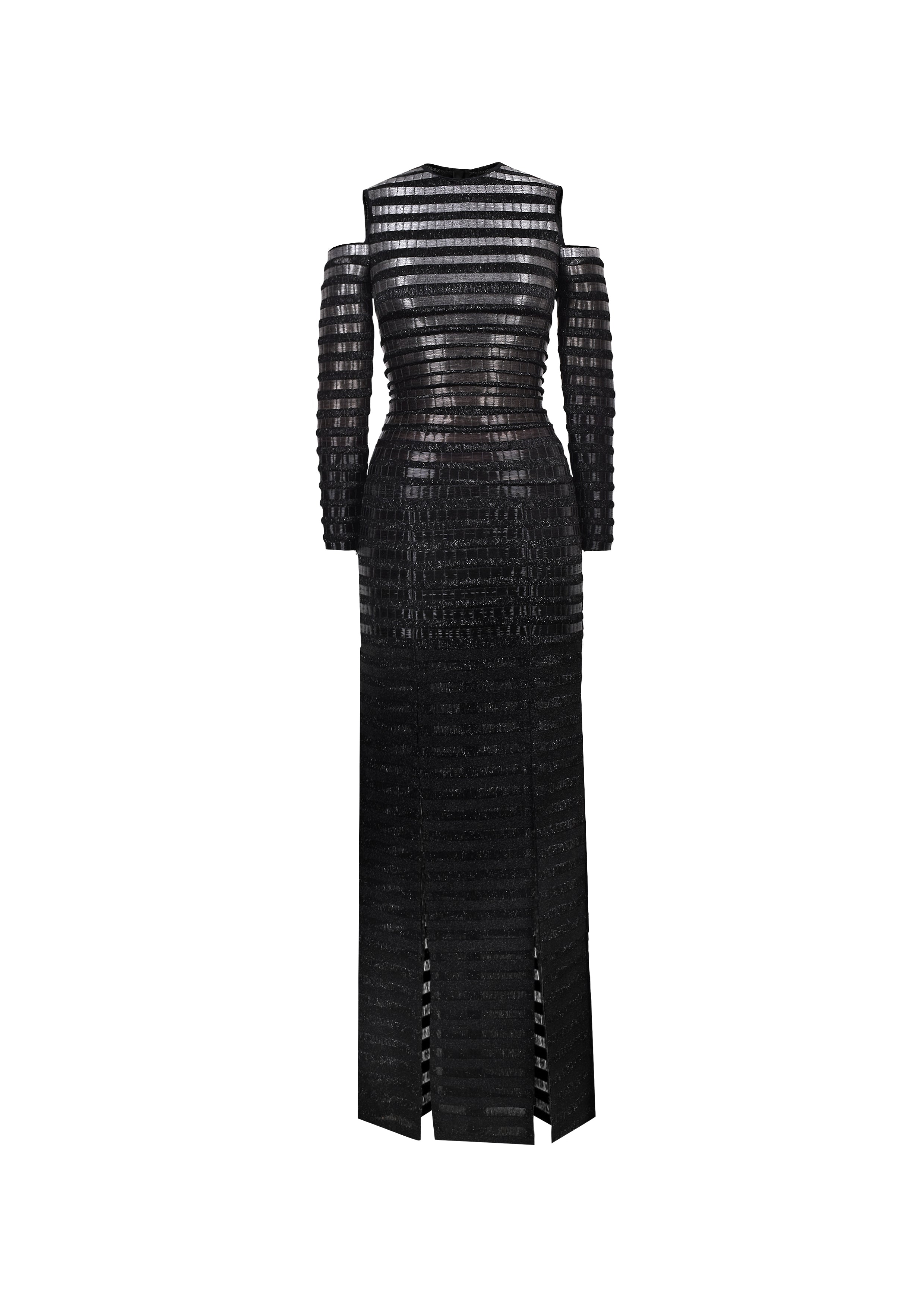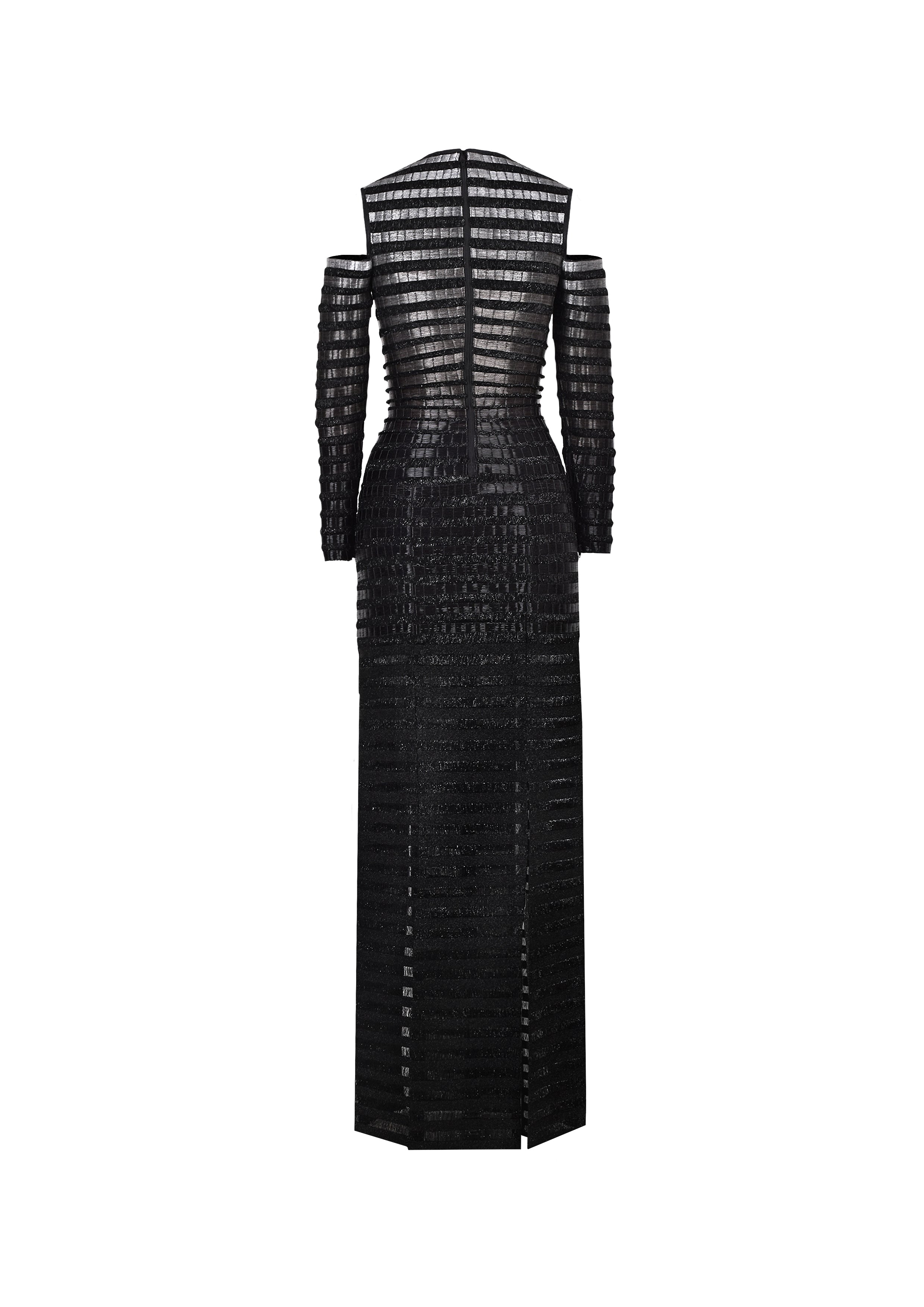 Hand-dyed gradient glass yarns hand-embroidered on a Lurex base.