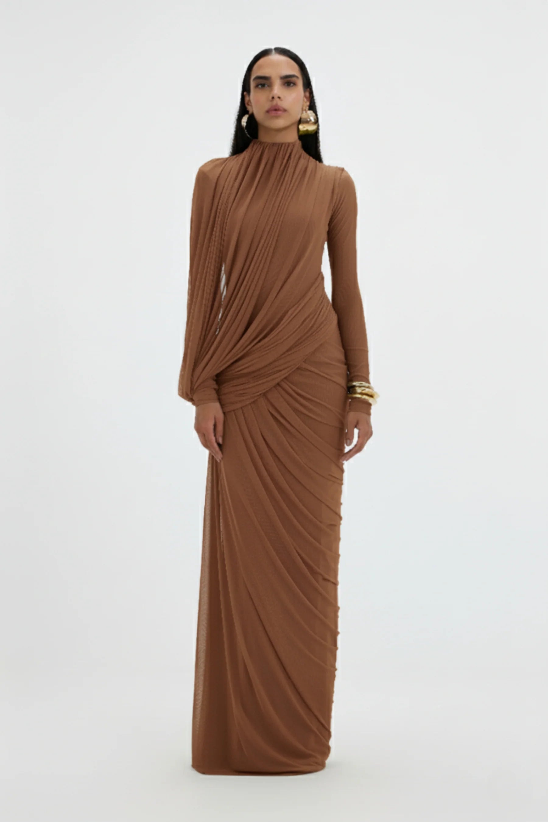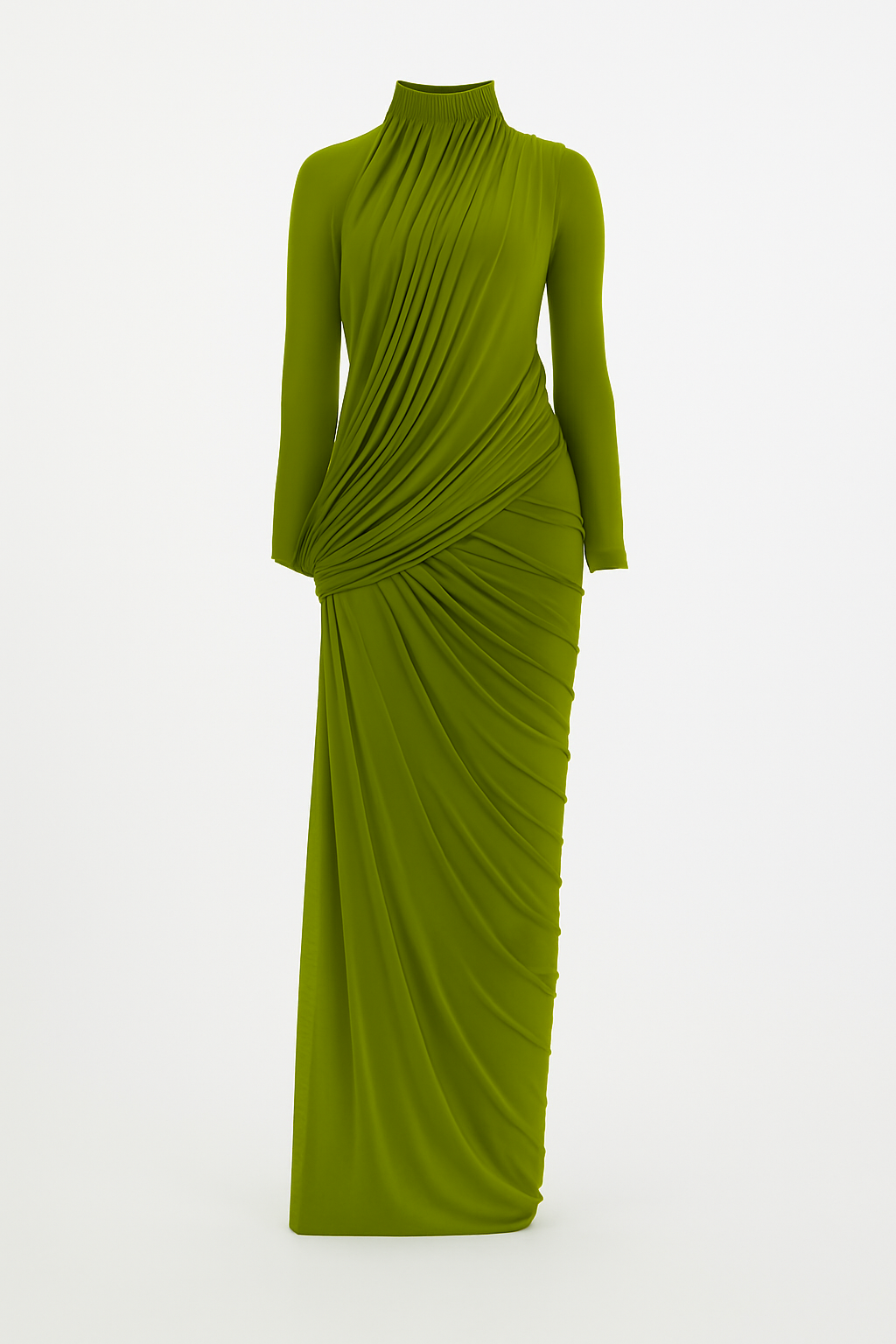 A sculptural silhouette, this high-neck gown features full sleeves and an artfully draped bottom that cascades asymmetrically from one side. At the top, a pleated drape flows from the neckline, elegantly twisting around the arm and anchoring at the side to form a soft loop — allowing the hand to slip through effortlessly. A perfect blend of structure and fluidity, this gown redefines modern elegance with a touch of drama.