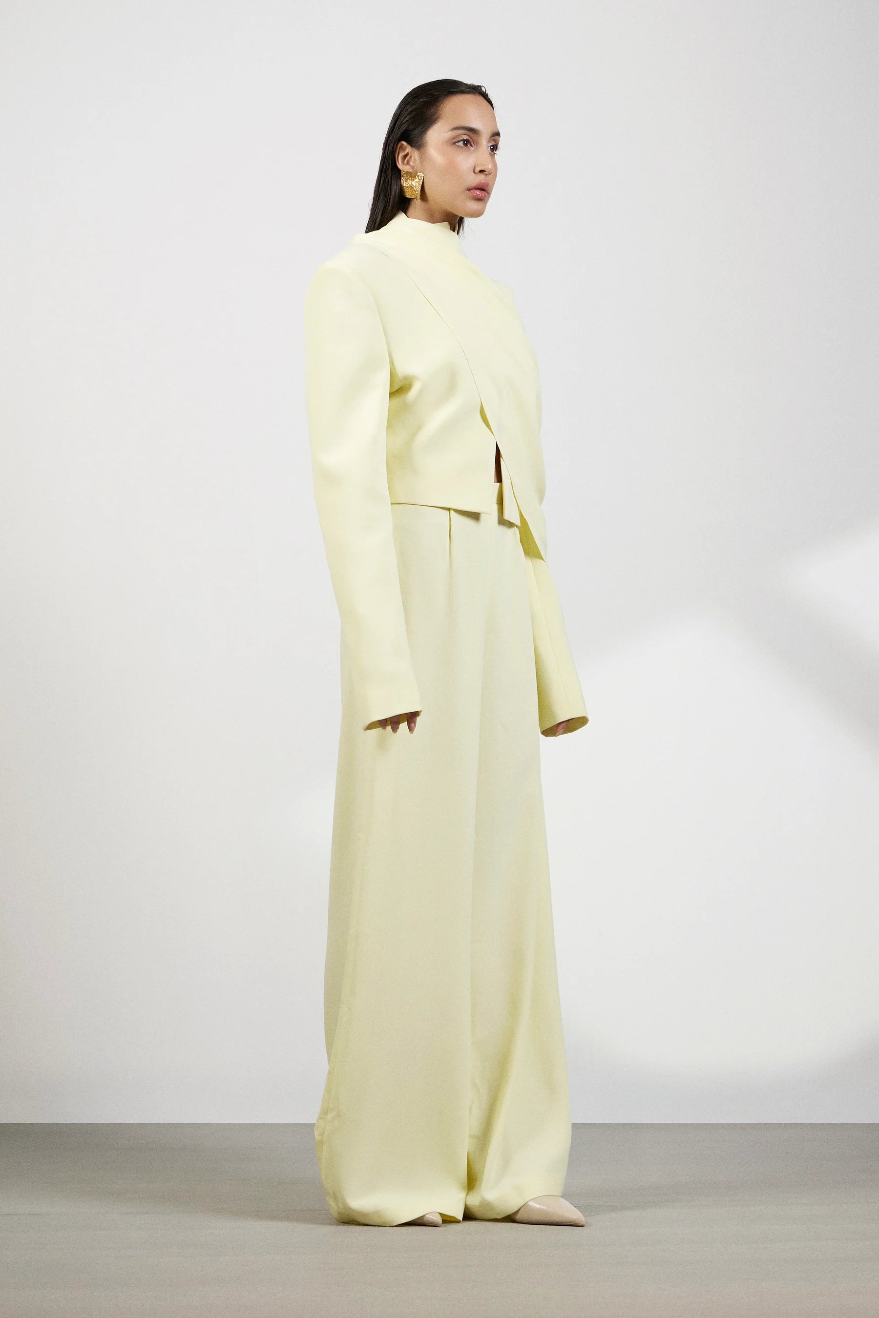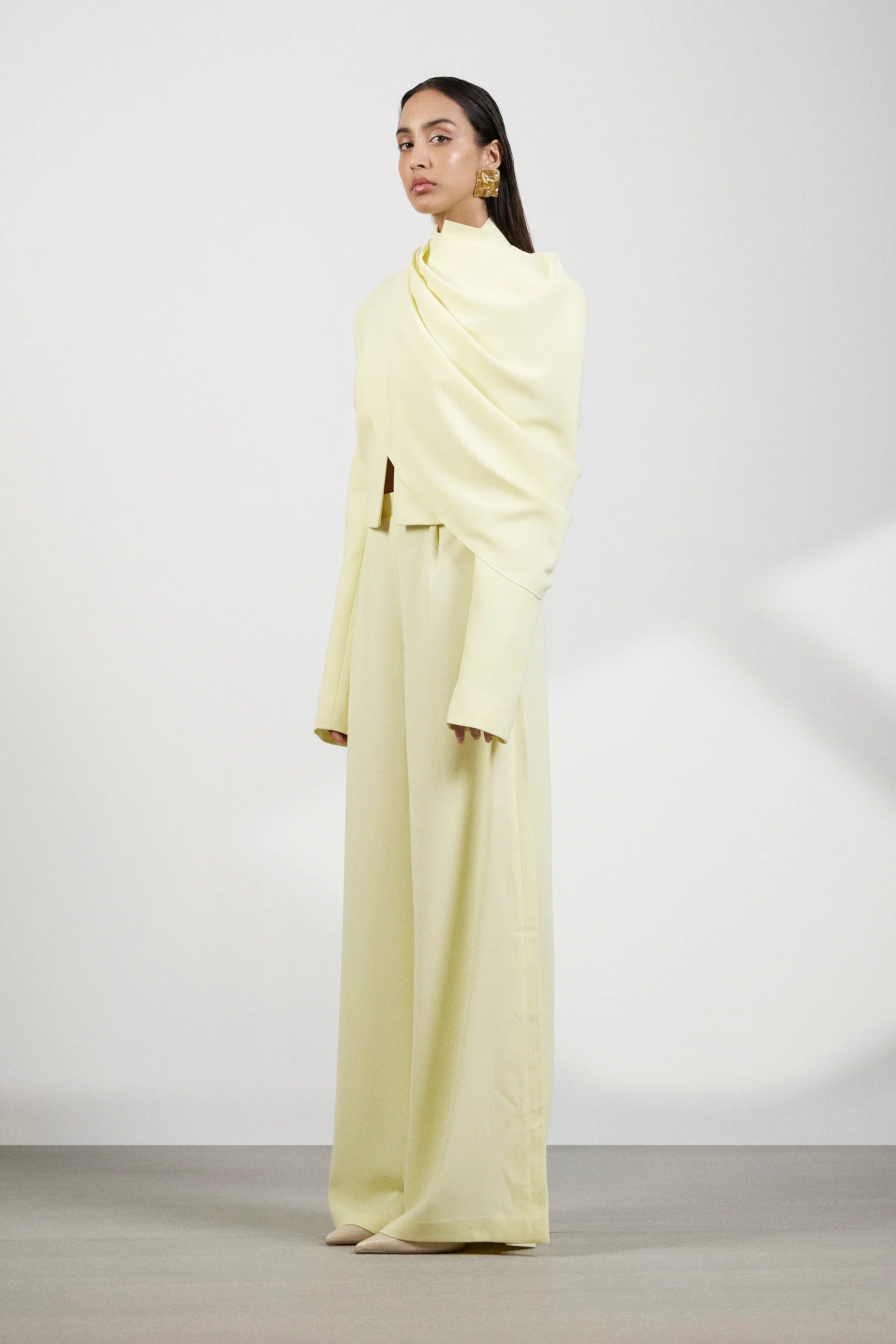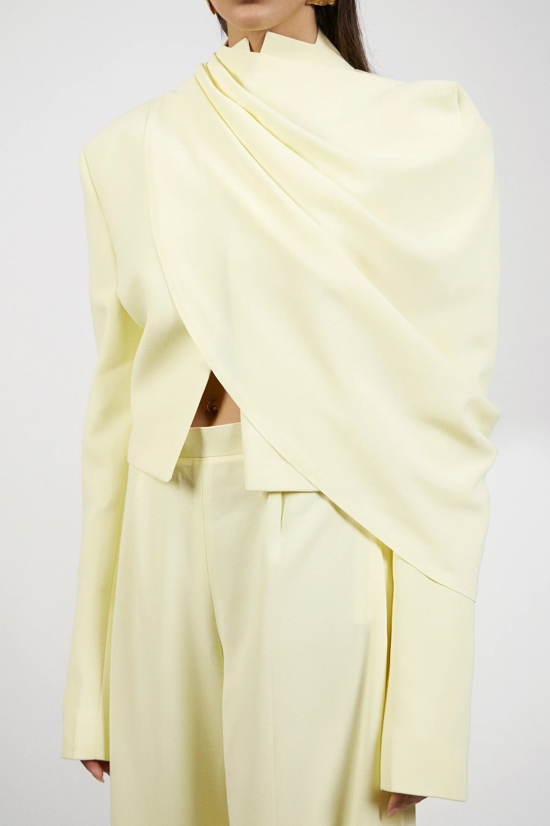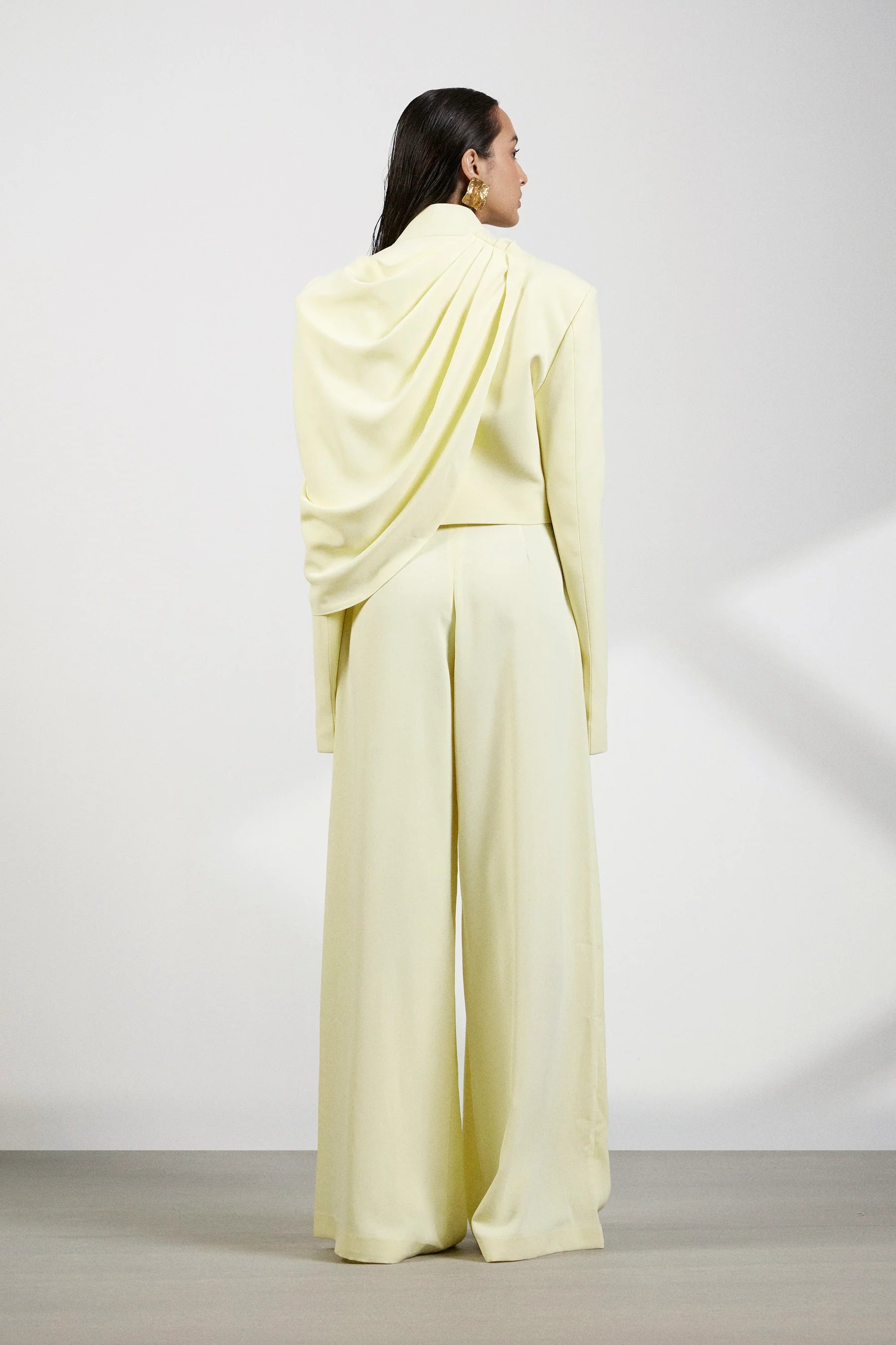 This striking suit set combines bold design with elegant structure. Crafted from rich fabric, the tailored flat pants offer a sleek, flattering fit. Paired with a cropped jacket featuring exaggerated shoulders, the jacket makes a strong statement. The unique design includes a pleated, draped cape layer that falls asymmetrically across the body, creating dynamic movement. Full sleeves complete the look, offering a balance of power and grace, perfect for those who appreciate modern sophistication with an edge.
