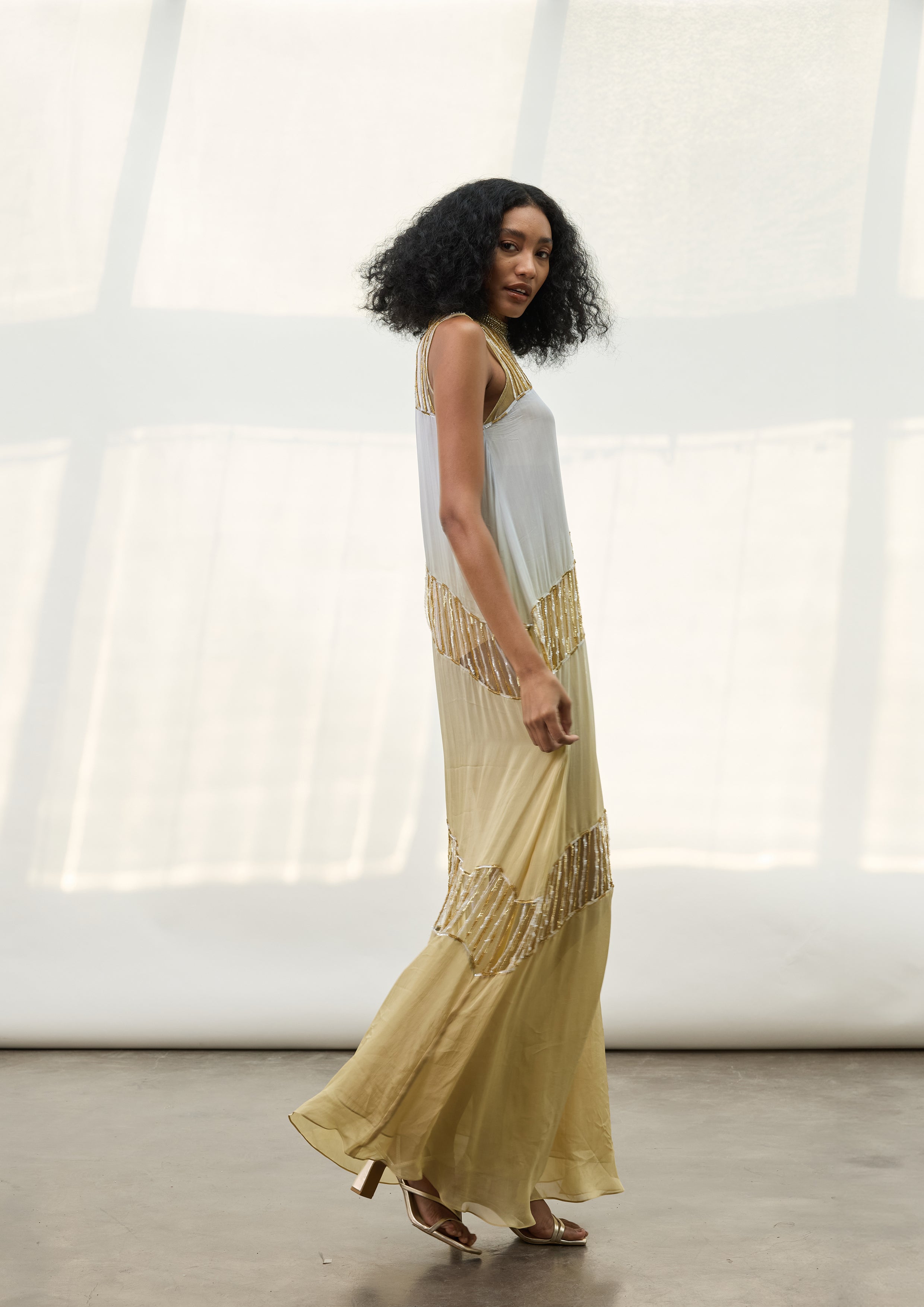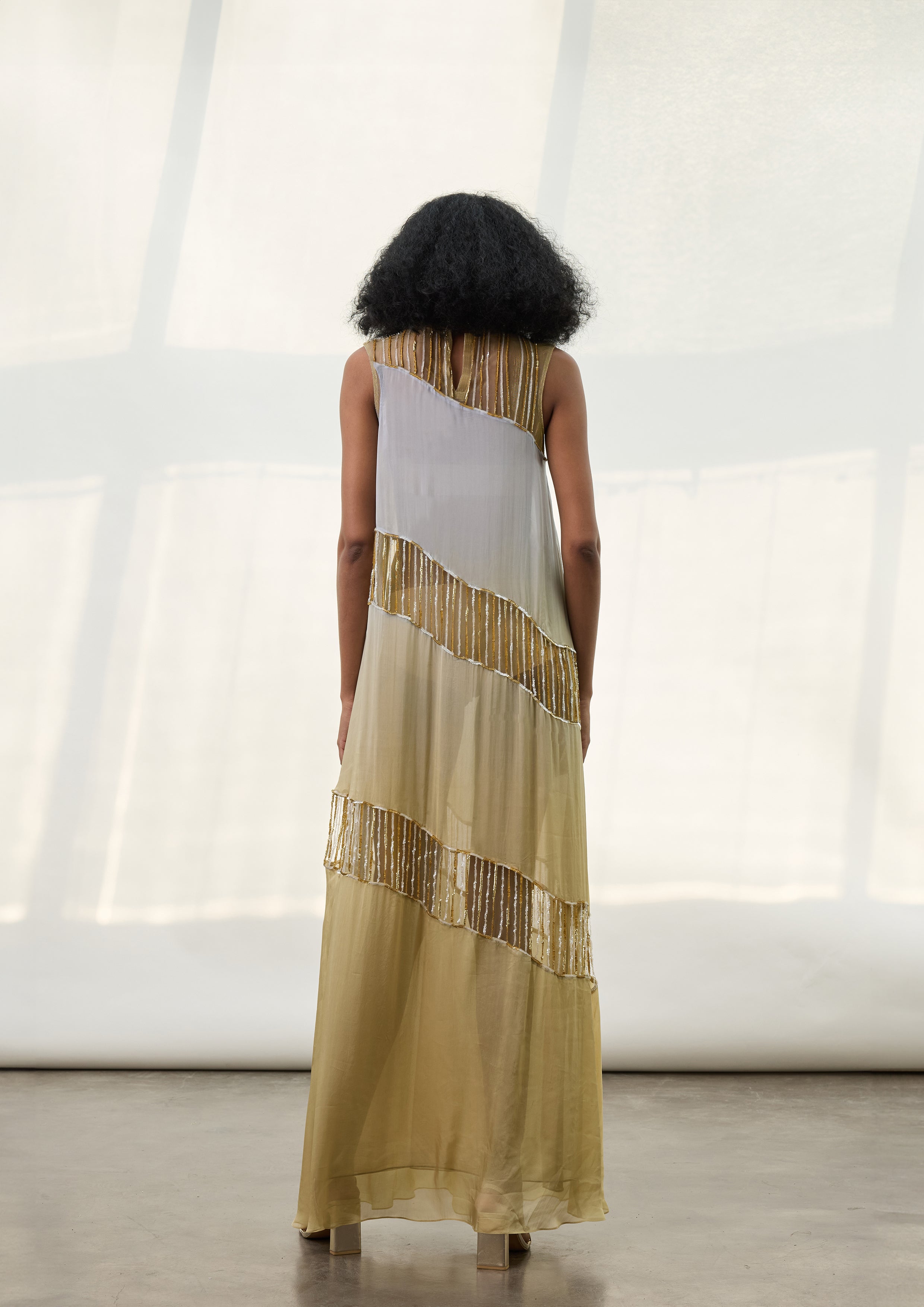 Chiffon ombre hand-dyed asymmetric diagonal tier dress with hand-embroidered sequin tassels and yoke.