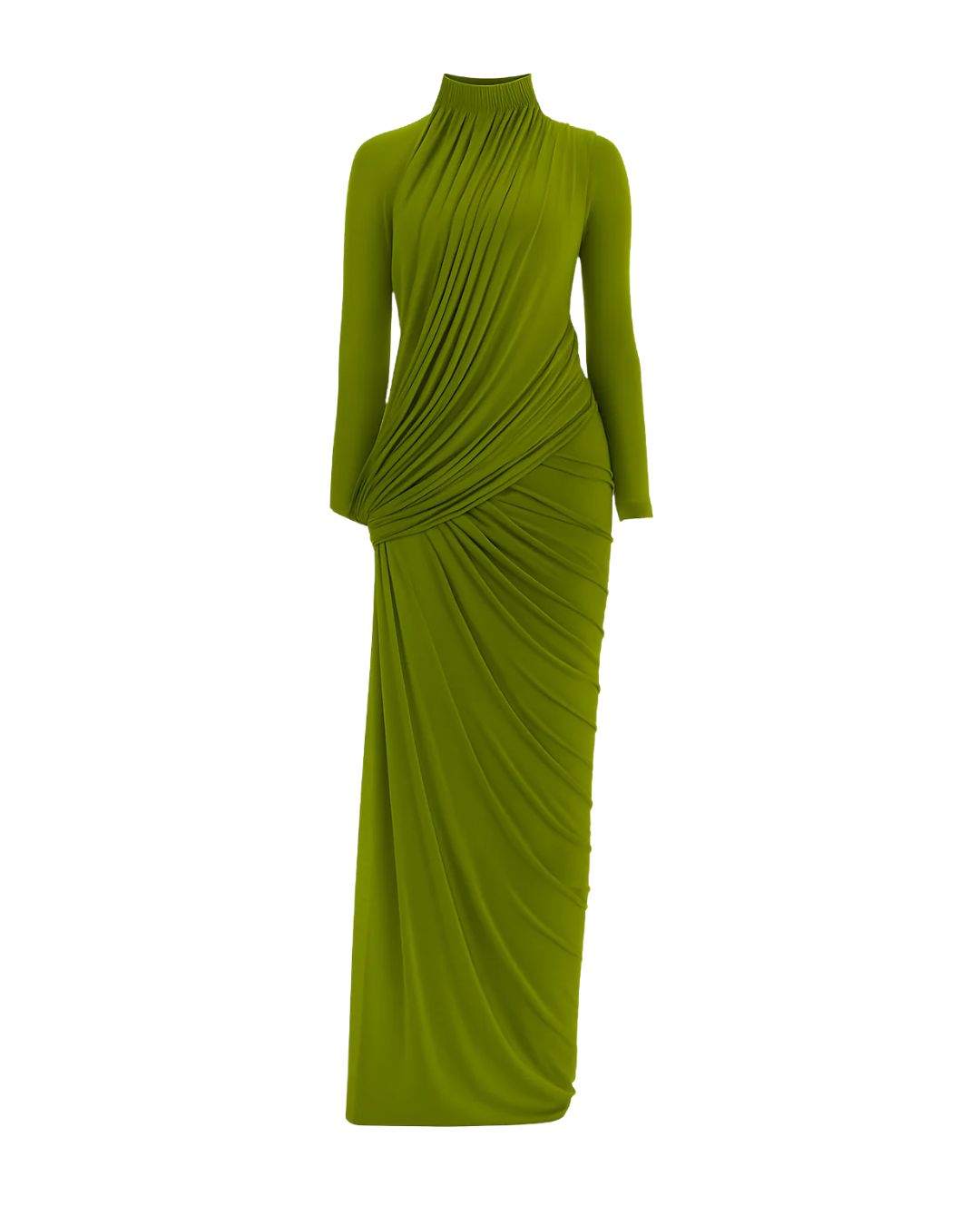 A sculptural silhouette, this high-neck gown features full sleeves and an artfully draped bottom that cascades asymmetrically from one side. At the top, a pleated drape flows from the neckline, elegantly twisting around the arm and anchoring at the side to form a soft loop — allowing the hand to slip through effortlessly. A perfect blend of structure and fluidity, this gown redefines modern elegance with a touch of drama.